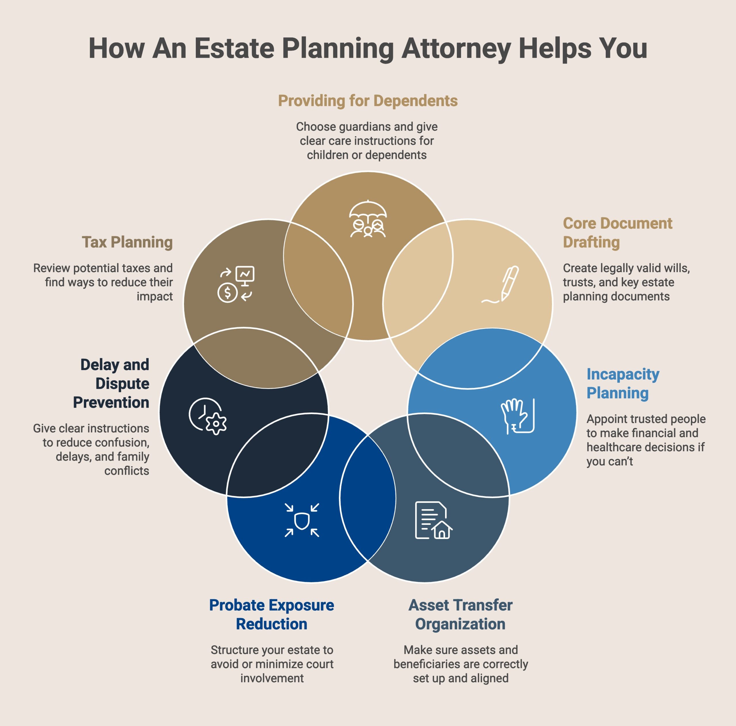 An estate planning attorney sets up the legal structure that determines how your assets are managed during your lifetime and passed on after death. This includes: